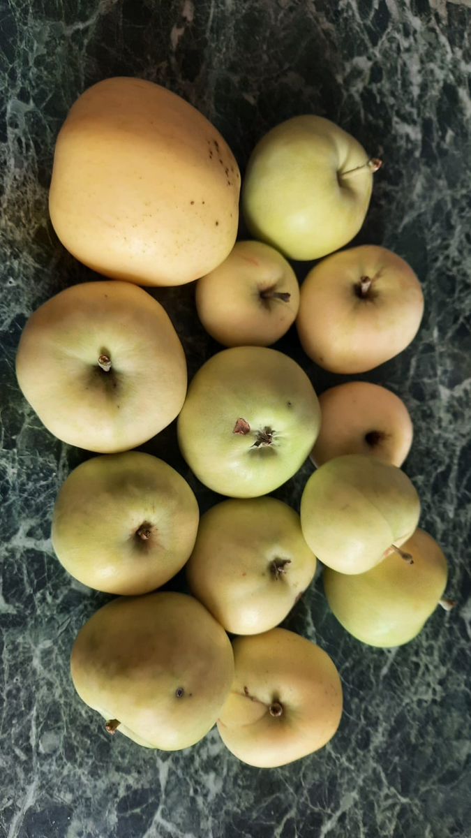 Плоды. Вот ради них и стоит посадить эту красавицу. Яблоки среднего размера, иногда крупные, массой от 80 до 120 граммов. Форма — округло-коническая, иногда слегка сплюснутая. Кожица тонкая, светло-жёлтая, почти белая, на солнце с легким янтарным румянцем. Мякоть — снежно-белая, сочная, нежная, тает во рту. Вкус — кисло-сладкий, освежающий, с лёгкой винной ноткой. И главное — аромат. Тот самый, который не спутаешь ни с чем: яблочно-травяной, как утренний туман над сенокосным лугом.