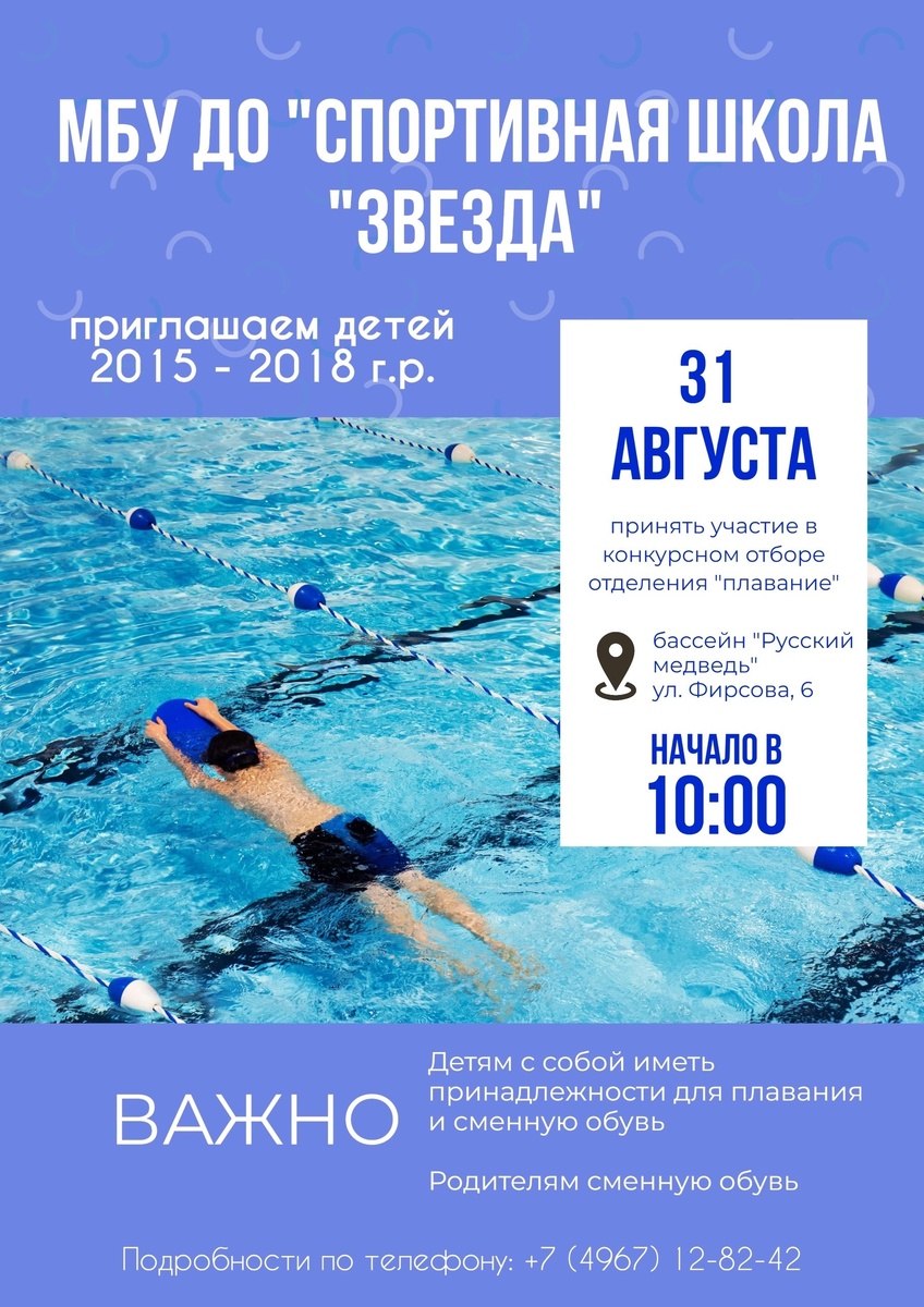 ✨ 💦МБУ ДО "СШ "Звезда" приглашает юных спортсменов 2015 - 2018 г.р. принять участие в конкурсном отборе отделения "Плавание" 📍Отбор состоится 31 августа 2025 года на базе бассейна "Русский медведь", находящегося по адресу: ул. Фирсова, 6 ✅Для участия необходимо заполнить электронную форму регистрации: docs.google.com/forms/d/1W... 📞По вопросам регистрации просьба обращаться по телефону +7 (4967) 12-82-42 или по адресу электронной почты sport749@mail.ru ❗️ВАЖНО❗️ Спортсмены старшего возраста могут принять участие в отборе только при наличии спортивного разряда! ⭐Разместить публикацию ⭐Поддержать голосом ✅ Мероприятия Серпухов https://dzen.ru/id/66f01c6eb4c6fe60c9ca1608 http://vk.com/serpukhov_events http://dzen.ru/serpukhov_events