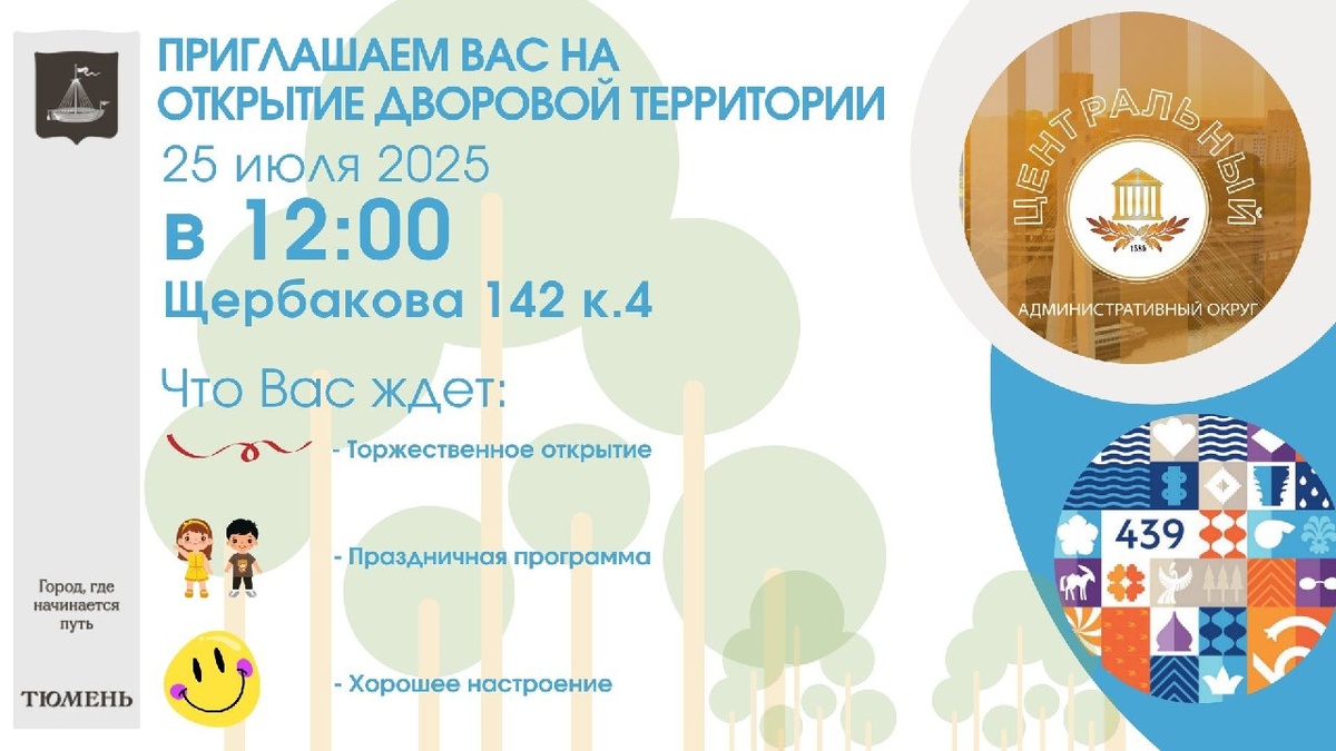 Открытие обновлённого двора в честь 439-летия Тюмени! Приглашаем вас на торжественное открытие благоустроенной дворовой территории по адресу: ул. Щербакова, дом 142, к. 4! Когда: 25 июля 2025 года Время: 12:00 Место: ул. Щербакова, д. 142, к.4 Что вас ждёт: Торжественное открытие обновлённого пространства. Яркая праздничная программа. Весёлые развлечения для всей семьи. Незабываемые впечатления и отличное настроение. Приходите всей семьёй, приводите друзей и соседей. Вместе мы создаём комфортную городскую среду! Приходите, будет ярко и весело! ✨