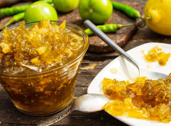 Варенье из тыквы, моркови или кабачков уже никого не удивляет, но вот помидоры, это что-то новенькое! И хоть на первый взгляд столь необычный кулинарный эксперимент смущает, Елена Егорова уверена, что в итоге вы скажете ей спасибо. Особенно любители острых блюд. Так что если пришлось собрать урожай помидоров досрочно, не горюйте, а варите! Ингредиенты: на 1 кг крепких зеленых помидоров 600 г сахара, 1 лимон и 1 стручок зеленого перца чили. Разрезаем помидоры пополам, удаляем плодоножку и уплотнение возле нее, а также все повреждения и пятна. Острым ножом мелко нарезаем каждый плод на кусочки менее половины сантиметра. Кладем нарезанные помидоры в широкий сотейник с толстым дном или жаровню. В помидоры насыпаем сахар. Лимон вместе с цедрой натираем на терке или измельчаем в блендере. Если порезать цедру крупно, то в варенье будут попадаться жесткие кусочки. Стручок чили разделяем пополам, достаем семена и перегородки, сам чили мелко рубим и тоже добавляем в варенье. Хорошо все перемешив