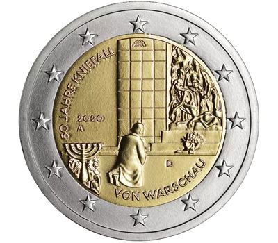 Однажды моя жена принесла мне монету в два евро, которой у меня не было. В золотистом круге ее аверса изображен мужчина, опустившийся на колени перед частью то ли большой пластины, то ли памятника. Слева внизу за корпусом мужчины на границе круга вычеканена ханукия. На обрезанной пластине, в правой ее части, виден угол барельефа с изображениями людей. На ступеньке пред пластиной — - букет цветов, и с левой стороны указана дата выпуска монеты — 2020.
