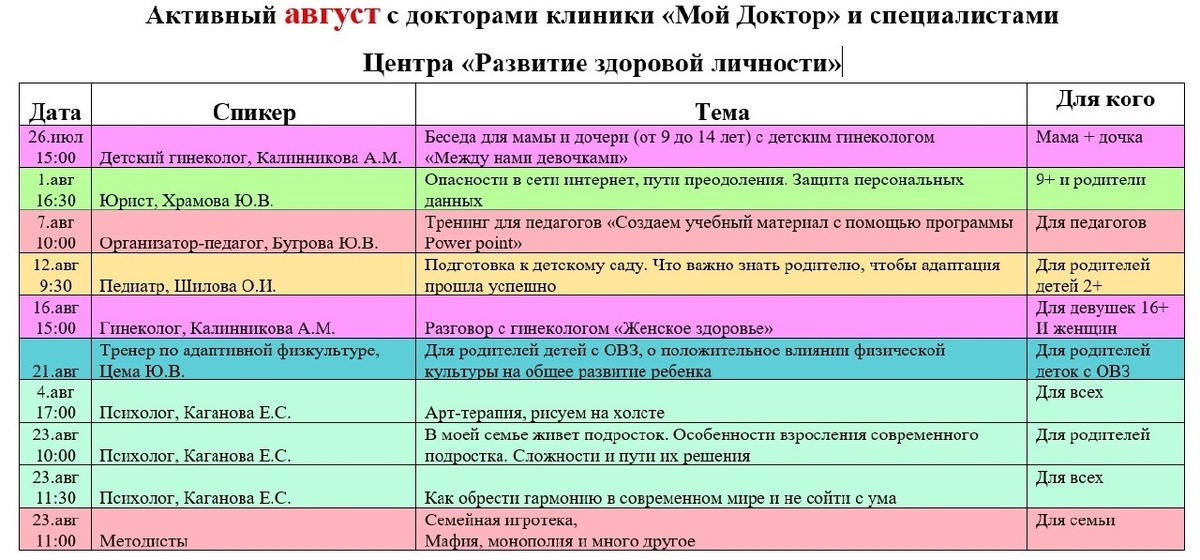 ↗ Специалисты Центра "Развитие здоровой личности" проведут 10 встреч о важном С 26 июля по 23 августа все желающие смогут присоединиться к занятиям на различные темы: здоровье детей, безопасность в интернете, отношения внутри семьи, подготовка к детскому саду и многое другое. Бесплатные встречи пройдут в Центре «Развитие здоровой личности» по адресу улица Силкина, 10/1. Количество мест ограничено, обязательна предварительная запись по телефону 5-99-60.