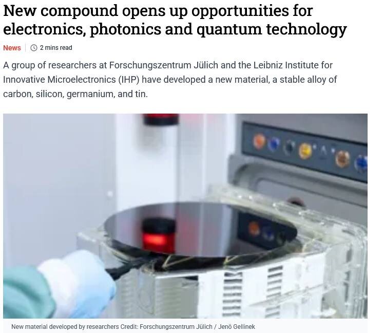 Немецкие ученые совершили прорыв! Им удалось синтезировать уникальный полупроводниковый сплав CSiGeSn, объединивший в одном материале четыре ключевых элемента IV группы таблицы Менделеева: Этот материал не просто новинка, он открывает новые горизонты на стыке самых перспективных технологий: CSiGeSn совместим с существующими промышленными КМОП-процессами! Это значит, что его внедрение может быть гораздо более быстрым и масштабируемым, чем у многих других инновационных материалов. Что умеет CSiGeSn? Секрет – в углероде. Главная "фишка" нового сплава – добавление углерода к уже известной системе SiGeSn. Это дает невероятную возможность: точно "настраивать" ширину запрещенной зоны материала. Зачем это нужно? Такая точная настройка позволяет создавать устройства, о которых раньше только мечтали: Создать такой сплав раньше считалось практически нерешаемой задачей. Причина – огромная разница в размерах атомов: крошечный углерод vs. крупное олово. Как их "подружить"? Решение: Немецкие