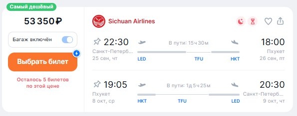 ✈️Санкт-Петербург - Пхукет (Таиланд), пересадка в Чэнду, туда и обратно, с багажом за 53350 рублей