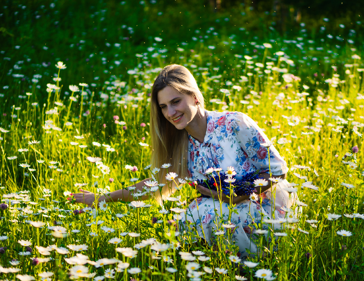 Я предложил Лене выехать вечером на берег Амура и провести фотосессию там. Все же у воды попрохладнее. Но девушка хотела пофотаться в цветочках, и мы отправились за город, на лесные полянки с ромашками и люпинами.