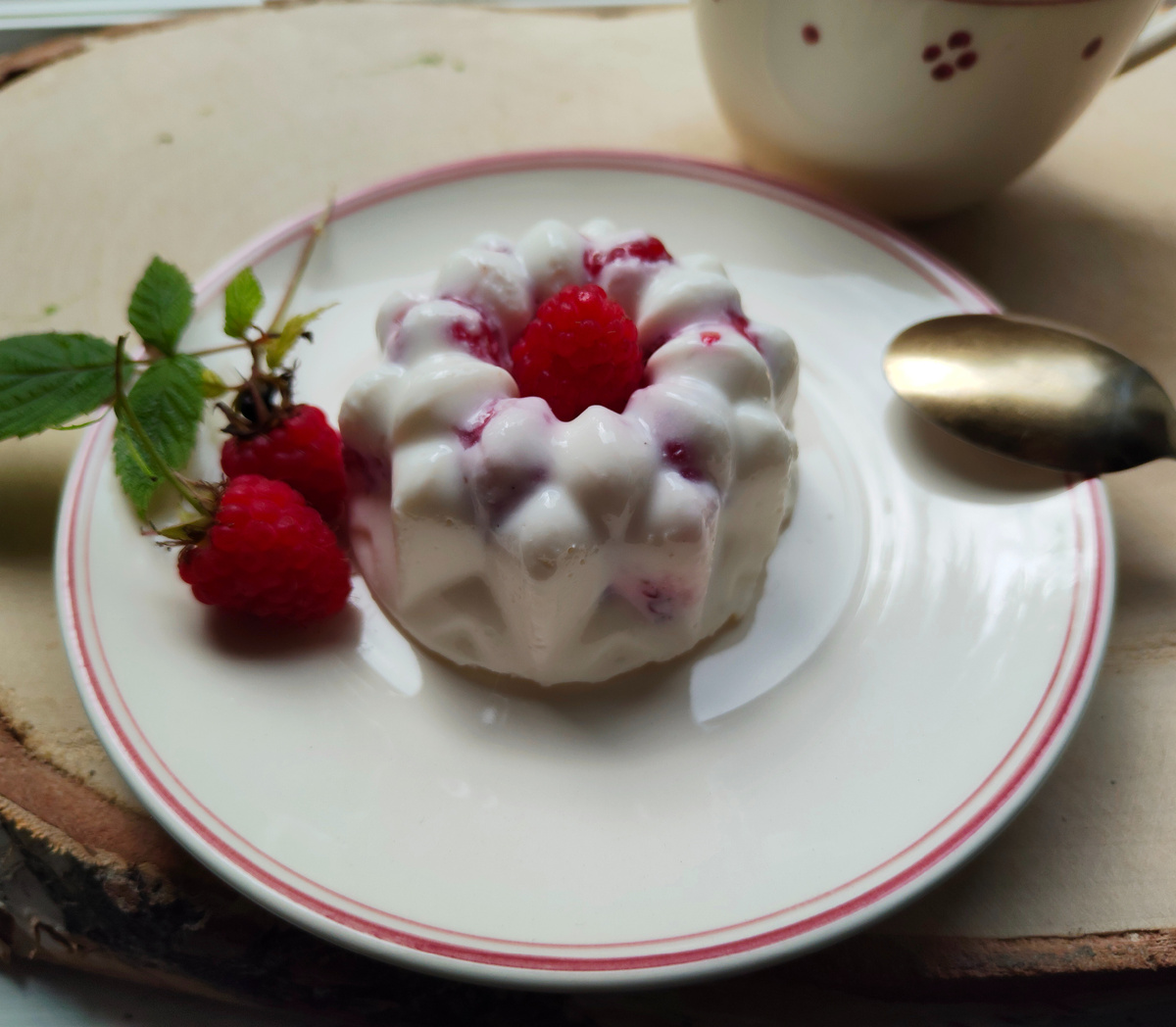 Название этого французского десерта переводится как "белое кушанье". Предлагаю приготовить самый простой вариант, с творогом и малиной: - творог 180 г - молоко 160 г - сметана 100 г - сахар 60 г - сахар ванильный 8-10 г - желатин быстрорастворимый 10 г - свежая малина примерно 1 стакан с горкой Также будут нужны формочки для кексов, но, если их нет, можно взять и что-то другое - креманки, пиалы, стаканчики. Заливаем желатин горячим молоком (60 градусов). Сюда же добавляем сахар - простой и ванильный, перемешиваем и оставляем на столе на 20 минут⏳. Время от времени помешиваем: Кладём в чашу блендера творог, сметану, добавляем процеженную через ситечко желатиновую массу. Пробиваем погружным блендером до однородности: В формочки (у меня силиконовые) выкладываем чистую малину. Я заполняю формочки примерно наполовину - количество ягоды можно варьировать на ваше усмотрение: Ставим формочки на дощечку и заливаем жидкой заливкой вровень: Помещаем десерт в холодильник примерно на 3-4 часа,
