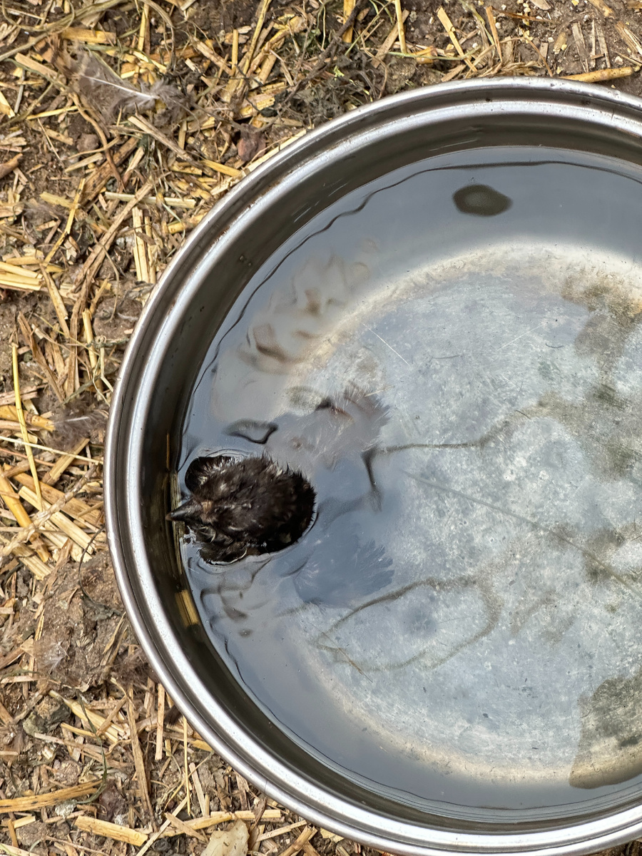 Причем думал ведь, не случится ли такое. Но цыпленок из своего гнездового ящичка с бортиком 6 см самостоятельно выбраться не мог, так что кастрюлька с водой, стенка которой 13 см, пока ему, вроде, не должна была быть опасной.