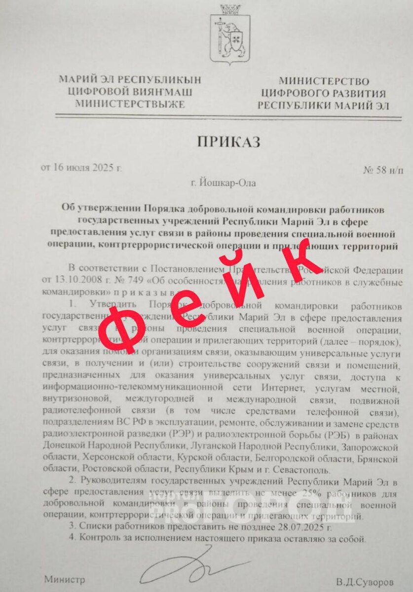 ❗️ В соцсетях Марий Эл вновь распространяется фейковый приказ, но на этот раз для отправки в зону СВО работников государственных учреждений республики. «Документ» датирован 16 июля 2025 года и на нем стоит подпись министра цифрового развития Марий Эл Венедикта Суворова. В нем рассказывается об утверждении порядка добровольной командировки работников государственных учреждений РМЭ в сфере предоставления услуг связи в районы проведения СВО, контртеррористической операции и прилегающих территорий, пишет «Про Город Йошкар-Ола». Между тем, в ведомстве уже опровергли этот фейк, заявив, что ничего подобного не подписывалось, а документ является ненастоящим. 📸 Фото: Про Город Йошкар-Ола