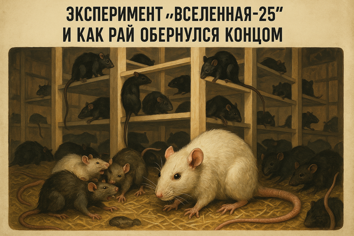 В 1968 году американский этолог Джон Кэлхун провёл один из самых известных и в то же время тревожных экспериментов в области этологии и социальной психологии «Вселенную-25». Этот эксперимент стал символом изучения последствий перенаселения, социального стресса и деградации поведения в замкнутом пространстве. Кэлхун построил специальную «идеальную» среду, просторный загон, который получил название «Вселенная-25». В нём создавались все условия для жизни — достаточно пищи, воды, отсутствие хищников и болезней. В эту среду он поместил небольшое количество мышей (четыре пары) и наблюдал за их поведением и популяцией. Поначалу колония развивалась как в лучшем сценарии: мыши размножались, число особей быстро росло и в пике достигло порядка 2200 особей. Казалось, что в идеальных условиях популяция будет увеличиваться бесконечно. Но уже спустя несколько месяцев начали проявляться тревожные симптомы. Когда численность мышей достигла пика, начались социальные конфликты, агрессия, асоциальное пове