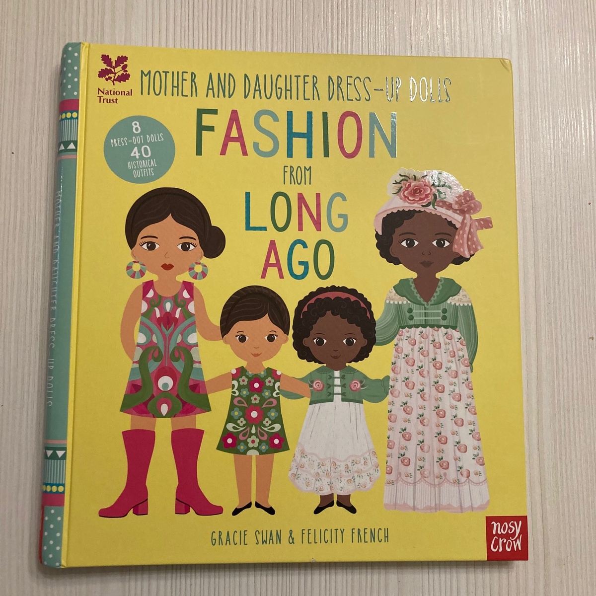 Добрый день, дорогие читатели! Сегодня будем вспоминать историю моды. Для этого у меня есть замечательный наборчик, называется "Fashion from Long Ago" (Мода давних времен), авторы Грейси Суон и Фелисити Френч. Заказывала его себе из Англии, когда это еще было возможно. И наконец он дождался своего часа. В книге четыре пары кукол, мамы с дочками, представляющими разные расы. И куклы, и одежда из книги выдавливаются, вырезать ничего не надо. Кроме того, одежда двусторонняя, не в том смысле, что есть перед и спинка, а в том, что с изнаночной стороны напечатан другой наряд. С одной стороны, это увеличивает количество нарядов, но с другой - из-за загибания туда-сюда клапаны быстро приходят в негодность, то есть в игре такие наряды недолго проживут. В наборе представлена одежда от Средних веков до 1970-х. К каждой паре нарядов придумана небольшая история - маме с дочкой даны имена и написано, куда они идут или что делают в такой одежде. Примеры: Еще один небольшой недостаток набора - аксессу