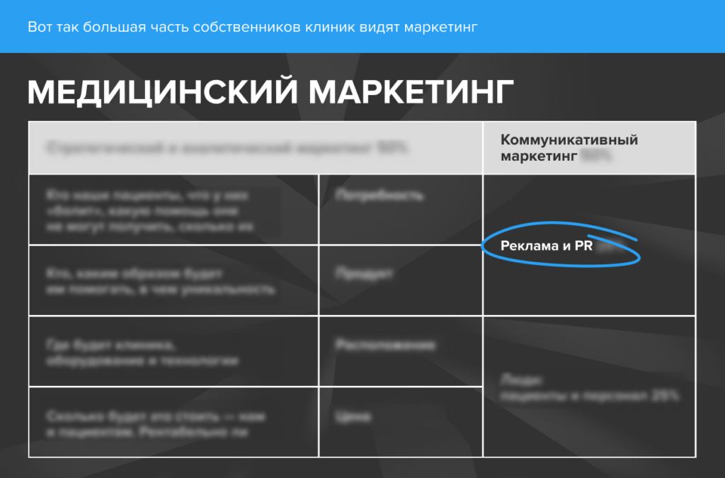 Только сформулировав стратегию и аналитическую часть, можно эффективно заниматься рекламой и PR. Без этого мы будем попадать не в тех пациентов, не с той уникальностью, не с объективными УТП.
