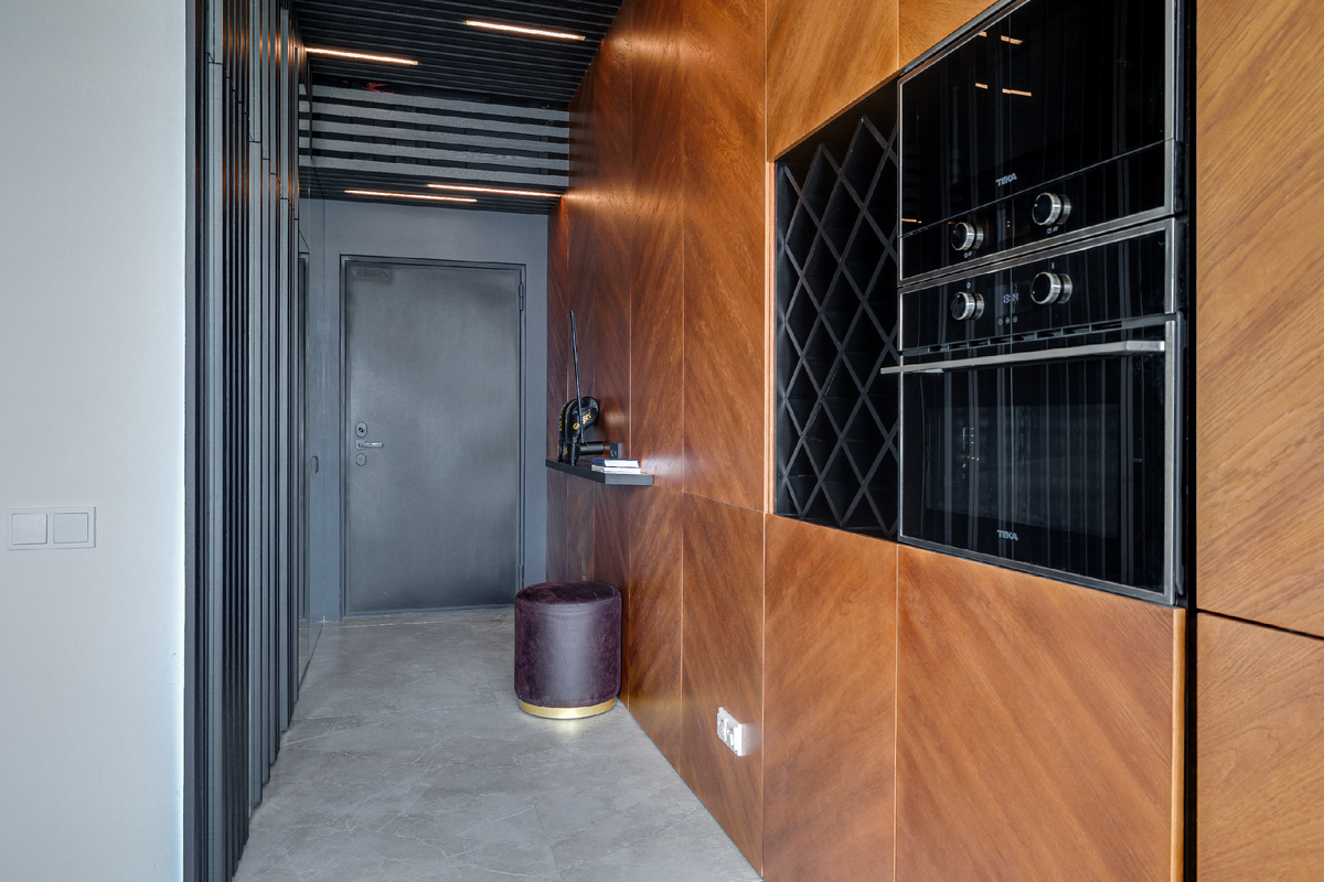 Переступая порог, вы попадаете в прихожую, где взгляд невольно цепляется за необычный реечный шкаф. Его фасады – настоящая игра: деревянные рейки ЛДСП чередуются с зеркальными вставками, создавая иллюзию глубины, будто за ними скрывается еще одно измерение пространства. Напротив, в стене, отделанной шпоном, уложенным под углом – будто елочкой, – прячется изящная ключница, добавляя динамики первому впечатлению. Шпонированная стена плавно ведет вас дальше, перетекая в кухонную зону. Здесь она становится основой для бесшовного встраивания всей необходимой техники: холодильник, духовка, микроволновка гармонично соседствуют с открытой винной полкой, превращая хранение в элемент дизайна. А сама зона готовки, аккуратно спрятанная за поворотом стены в углублении, остается скрытой от входа, сохраняя чистоту линий. Выходя из прихожей вы оказываетесь в просторной кухне-гостиной. Главное ее украшение – панорамные окна во всю стену, создающие ощущение простора. Хотя здесь часто собираются гости, тр