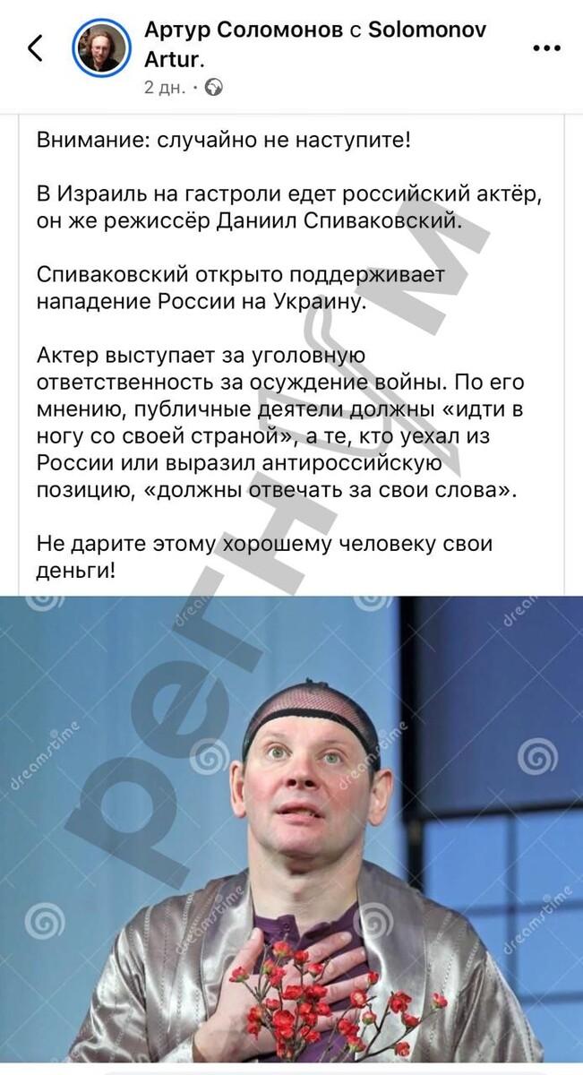 Активные антироссийские перебежчики в Израиле снова негодуют. Причина все так же - на гастроли на "землю обетованную" едут пророссийские артисты. А именно, Даниил Спиваковский привозит в "мирный" Израиль свой новый спектакль. Иноагент Артур Соломонов (тот самый, кто собирает средства на ВСУ с помощью своих постановок про то "Как мы хоронили Иосифа Виссарионовича", в которых участвуют исключительно антироссийские актеры-перебежчики и иноагенты вроде Анатолия Белого, Татьяны Лазаревой, Михаила Шаца и т.п.) опубликовал целый пост с требованием к новоприобретенным соотечественникам бойкотировать выступление Спиваковского. Единомышленники иноагента Соломонова идею поддержали. Но увы, с воплощением не задалось. Оказалось что, во-первых, и в "мирном" Израиле много россиян, готовых рублем голосовать за приезжающих из РФ соотечественников, а во-вторых, даже в "мирном" Израиле не все поддерживают проукраинскую политику и с удовольствием идут смотреть на заезжих из России знаменитостей. А поэтому