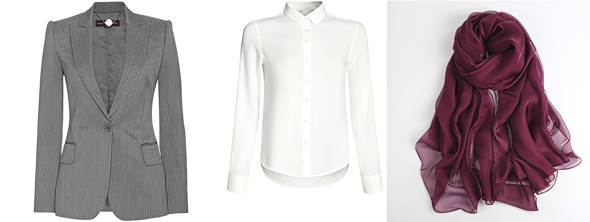 Принцип сочетаемости. Правило трёх цветов — не больше в одном образе. Один основной, один дополнительный и один акцентный. Серый жакет, белая блуза и бордовый шарф. Просто, но безупречно.