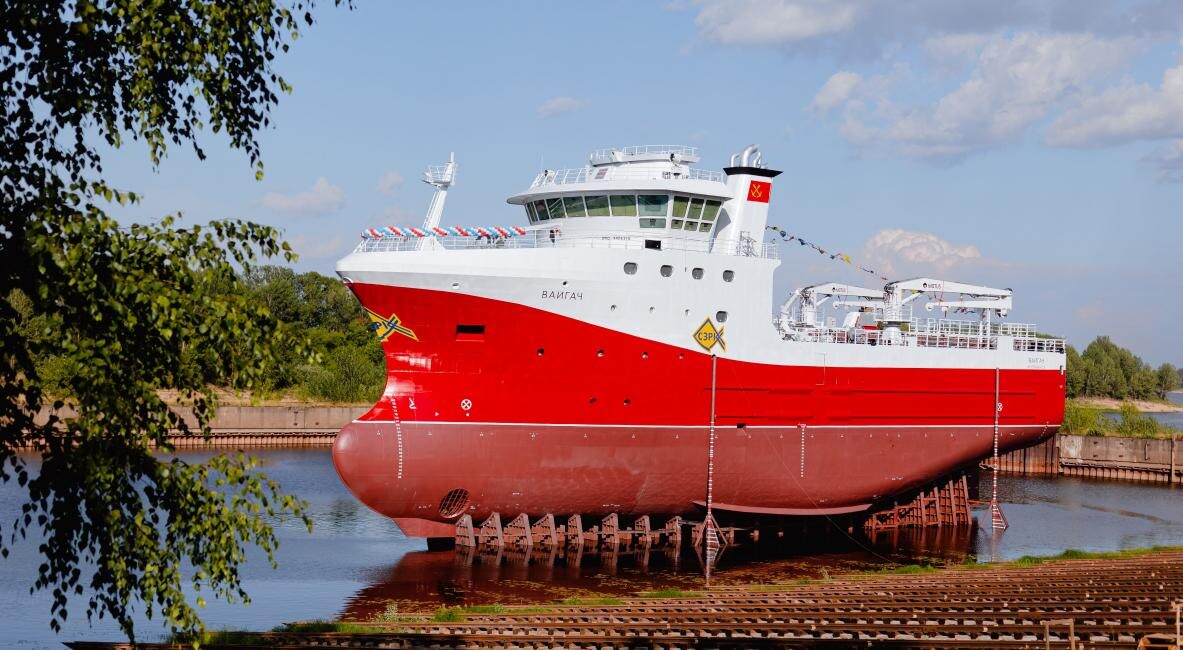 Краболов «Вайгач» проекта КСП01, который разработало «Морское Инженерное Бюро – дизайн — Спб». Оборудование судна предназначено для ловли и переработки до 60 т. камчатского краба в сутки. Автономность плавания – 50 суток, что позволяет передавать продукцию в море, не пришвартовываясь к берегу. Иллюстративное фото: судостроительный завод «Красное Сормово».