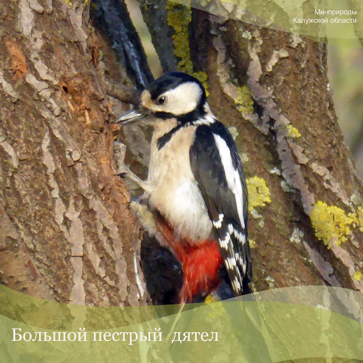 🌿На территории Калужской области обитает 10 видов дятлов, среди которых самым распространенным является большой пестрый дятел. Это птица размером немного меньше голубя с черно-белым оперением с овальными белыми пятнами на крыльях и красным подхвостьем. 🌿У взрослых темя черное, за исключением красного пятна на затылке у самца, а у молодых – темя спереди красное. Черные «усы» начинаются от клюва и соединяются перемычкой с черной окраской затылка. Полет у них волнообразный, состоит из чередований быстрых взмахов крыльями и полета со сложенными крыльями по инерции. Добывая корм, они долбят дерево и обдирают кору. 🌿Гнездятся в дуплах, которые делают в мягкой древесине. Питаются насекомыми и их личинками, зимой – семенами хвойных деревьев.
