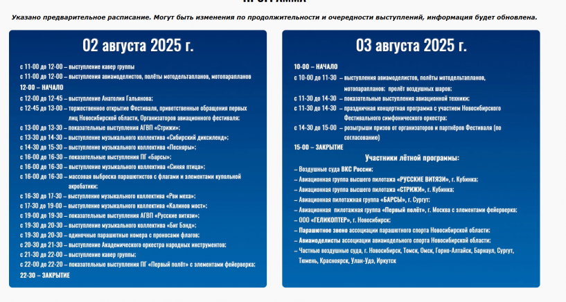 Основные события развернутся 2 августа: с 12:00 зрителей ждут выступления пилотажных групп, парашютистов, концертная программа и вечернее шоу с элементами фейерверка. 3 августа программа продолжится показательными выступлениями авиатехники и симфоническим концертом. Стоимость билетов составляет 200 рублей за один день или 300 рублей за абонемент на два дня, для детей до 12 лет вход свободный. Организаторы подготовили удобную инфраструктуру с детскими аттракционами, ярмарками и точками питания, чтобы сделать посещение комфортным для всех гостей этого грандиозного авиационного праздника.