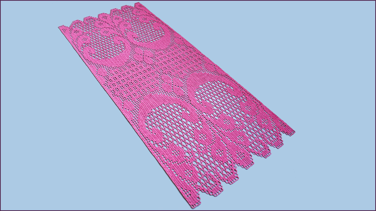 Филейная салфетка связана крючком 1,5 мм из пряжи DENDY, 100% мерсеризованный хлопок, в 50 граммах 330 метров. Размер филейной салфетки 95 на 43 см. Вес 126 граммов. Цвет пряжи 088 - "брусника". Такую салфетку можно использовать как салфетку-дорожку. Эта филейная салфетка состоит из двух раппортов. Вполне можно продолжать вязание крючком раппортов для получения более крупных изделий, например, скатертей или занавесок. Ссылка указана ниже: https://rutube.ru/video/8fc358851f4e11145eafae924a3784c8/