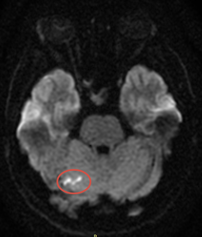 В отделение экстренной помощи поступил пациент 40 лет. Накануне он выполнял физическую нагрузку, после чего прилёг на кровать. При попытке встать с кровати внезапно возникли звон в ушах, головокружение, боль в области шеи, тошнота, рвота и расфокусировка зрения. Со временем жалобы постепенно регрессировали. При проведении магнитно-резонансной томографии головного мозга выявлены множественные очаги острого ишемического инфаркта в вертебро-базилярном бассейне с обеих сторон. Одной из частых причин развития такой патологии является наличие открытого овального окна (ООО) — анатомического сообщения между правым и левым предсердиями, которое в норме должно самостоятельно закрываться после рождения. При наличии ООО возможен парадоксальный эмболизм: тромбы из венозной системы через малый круг кровообращения попадают в артериальный (большой) круг. У пациента при проведении эхокардиографии было выявлено открытое овальное окно. В связи с этим рекомендовано дополнительное обследование для исключен