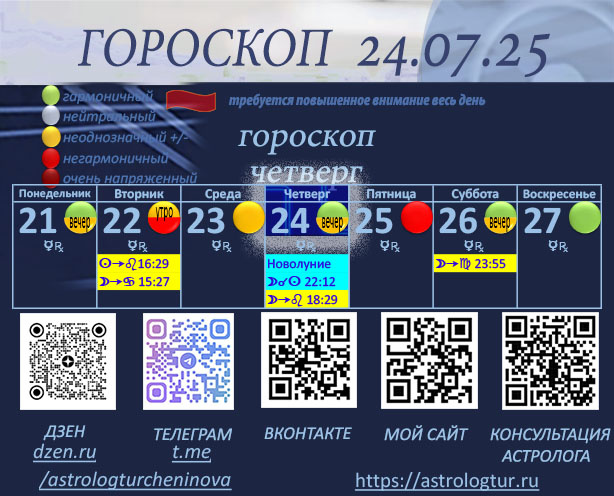 В первой половине дня Луна находится в Раке, что дарит эмоциональную чуткость и потребность в защищённой, привычной обстановке. Утренний благоприятный аспект Луны с Марсом добавляет решительности — хороший момент, чтобы навести порядок как в делах, так и в пространстве. Однако ретроградный Меркурий советует быть особенно внимательными в общении и работе с информацией. После 18 часов (мск) Луна переходит в Лев — эмоции становятся ярче, появляется желание признания, зрелищ и драйва. Это время для смелых действий, творчества, презентации себя и публичных выступлений. Благоприятный аспект Луны с Ураном, с 16 до 23 часов (мск), приносит творческое вдохновение и неожиданные идеи, которые помогут выделиться. Но из-за ретроградного Меркурия новые мысли и предложения требуют дополнительной проверки. Сегодня кульминация сразу двух благоприятных аспектов: • БЛАГОПРИЯТНЫЙ АСПЕКТ СОЛНЦА с САТУРНОМ (кульминация 24.07.25, влияние с 22.07.25 по 27.07.25). Аспект помогает нам структурировать и упорядо
