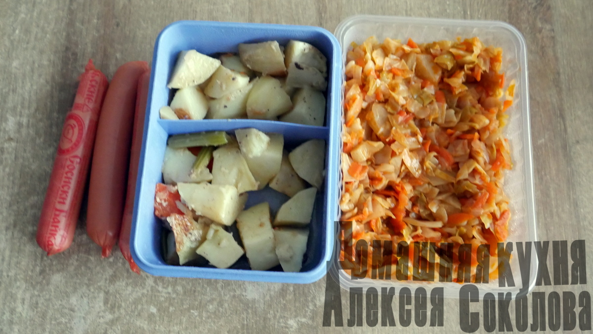 А когда к вечеру следующего дня есть готовая томленая тушеная капуста, есть картофель, то почему бы не добавить к ним, например, сосисок и не приготовить бигус на минималках?