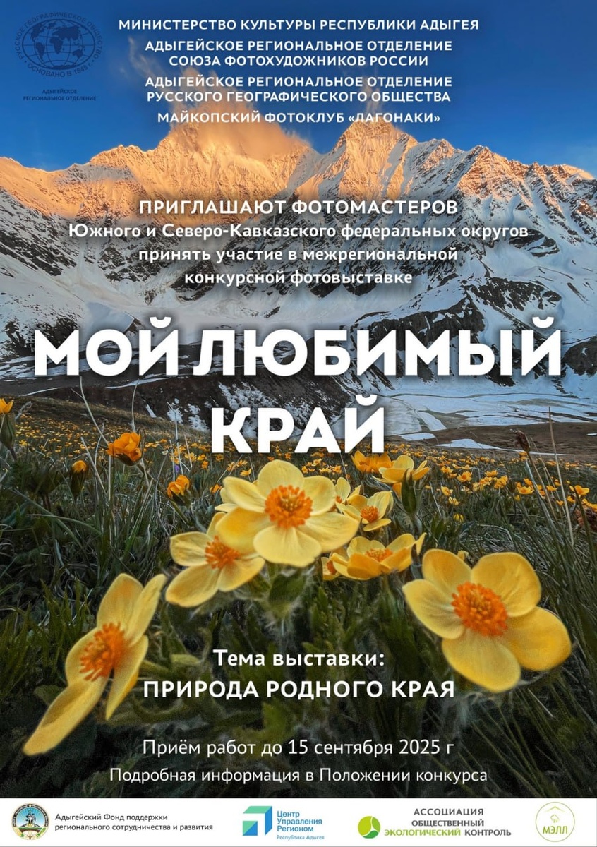 📸Открыт приём заявок на межрегиональный фотоконкурс «Мой любимый край» Региональное отделение Русского географического общества в Республике Адыгея совместно с Адыгейским отделением Союза фотохудожников России и фотоклубом «Лагонаки» объявляет конкурс среди жителей Южного и Северо-Кавказского федеральных округов. Цель конкурса — популяризация природного и культурного наследия регионов через фотографию. Работы принимаются до 15 сентября на почту arka-kirnos@mail.ru 📍Номинации: • Пейзаж родного края • Природа родного края 🏆Победителей и призёров ждут дипломы, памятные призы и участие в фотовыставке. 📎Положение о конкурсе и форма заявки по ссылке. #новости_минкульт_РА #РеспубликаАдыгея #Победа80
