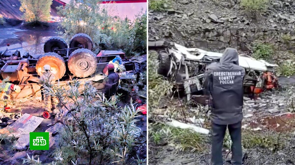 [ Смотреть видео на сайте НТВ ] Трагедия в Якутии — в городе Нерюнгри сорвался с обрыва автобус, перевозивший работников шахты «Восточная Денисовская». 13 вахтовиков погибли на месте, остальные получили травмы. Следователи выясняют причины ЧП — по предварительным данным, водитель не справился с управлением на опасном участке. Груда искореженного металла — это все, что осталось от рейсового автобуса после падения с 30- метровой высоты в овраг. В момент ЧП в салоне находились более 30 сотрудников шахты «Восточная Денисовская». Рабочие окончили смену и уже возвращались домой. 13 человек погибли на месте, еще около 20 получили травмы различной степени тяжести. Первыми на месте трагедии оказались коллеги погибших и раненых. Те, кто через 40 минут после автокатастрофы выехали следом с последней в тот день вахты. Выжившие рассказали, что им каким-то чудом удалось спастись в последний момент, за секунды до падения автобуса с обрыва. «Водитель медленно ехал, а в конце резко повернул, и народ по