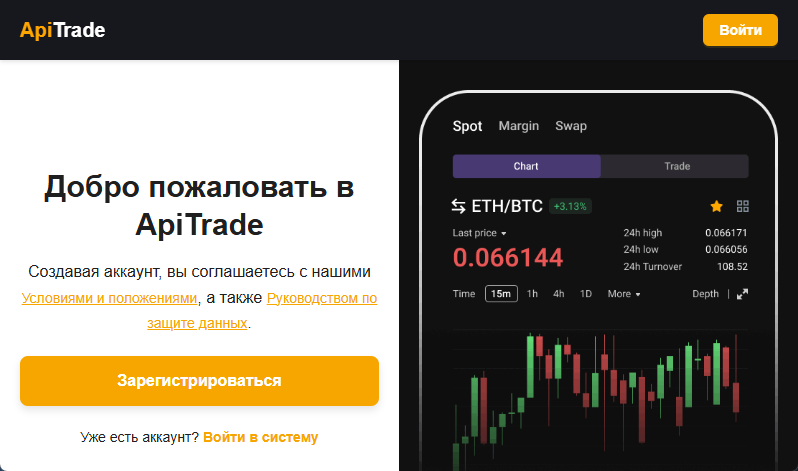 Проект ApiTrade функционирует как закрытая криптовалютная платформа, доступ к которой предоставляется только авторизованным пользователям и зарегистрированным клиентам с личным аккаунтом. Официальный сайт поддерживает русский язык и несколько других языковых версий, что обеспечивает удобство использования для международной аудитории. Свои услуги компания предоставляет сразу через несколько доменных адресов, что позволяет обеспечить стабильную работу вне зависимости от внешних факторов: Платформа «АпиТрейд» не раскрывает на официальном сайте сведения о юридической регистрации и правовом статусе, что может вызвать сомнения у потенциальных пользователей. До прохождения регистрации доступ к внутренней документации и условиям сотрудничества отсутствует. Контактные данные технической поддержки не опубликованы, поэтому связь с сервисом возможна лишь после регистрации через форму обратной связи, доступную во внутреннем разделе сайта. Ознакомиться со списком доступных для торговли на криптовал