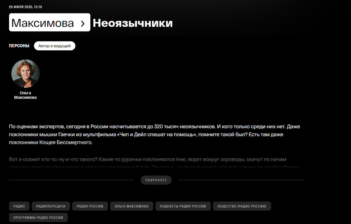 Месяц назад я впервые поучаствовал в съёмках документального фильма о неоязычестве. И вот теперь выступил в качестве эксперта по неоязычеству для записи радиопередачи. На прошлой неделе со мной связался редактор программы «Максимова», выходящей по воскресеньям на «Радио России», и попросила ответить на несколько вопросов. Эфир состоялся 20 июля 2025 г., в 13:10. Прослушать запись можно здесь.