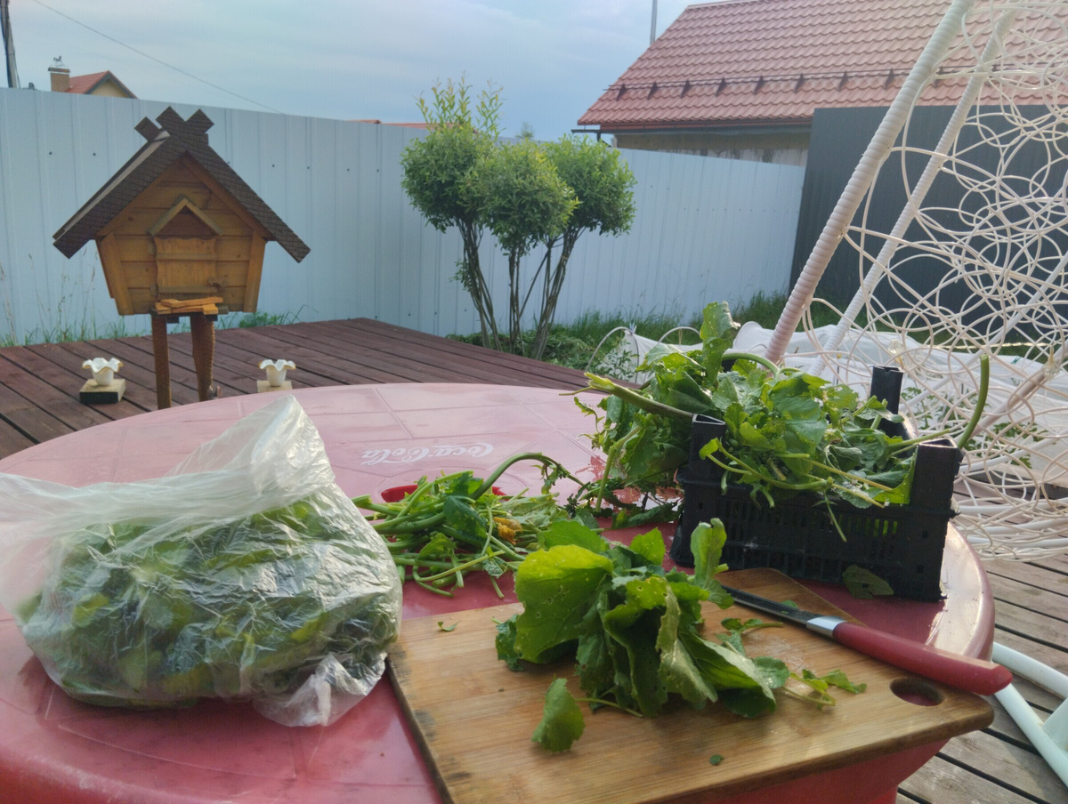 Пока ДМ готовил завтрак я порезала зелень от редиски в морозилку и собрала цветы кабачков