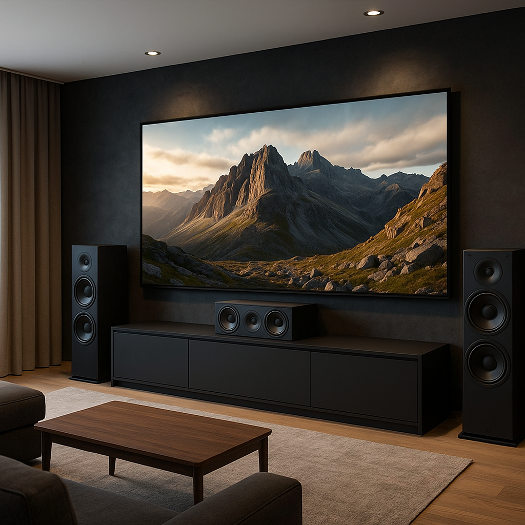 Современные домашние кинотеатры всё чаще строятся на основе по-настоящему больших экранов — ультракороткофокусных проекторов, 98–115-дюймовых телевизоров или даже microLED панелей. Но с ростом размера экрана возникает одна важная проблема: куда девать центральный канал? Ведь именно эта колонка отвечает за большую часть диалогов и звуков по центру сцены. Если разместить её слишком низко — звук будет идти из-под пола. Если поднять слишком высоко — возникает несоответствие между изображением и источником звука. Как решить эту задачу правильно — рассказываем в статье. Центральный канал — это более 60% аудиоинформации при просмотре фильмов. Правильное его размещение критично по нескольким причинам: Идеальное положение центральной колонки — на высоте головы сидящего зрителя, прямо за экраном, как это реализуется в классических кинотеатрах с акустически прозрачными экранами. Но если у вас телевизор или microLED — такой возможности нет. Для нестандартного размещения, например под или над экран