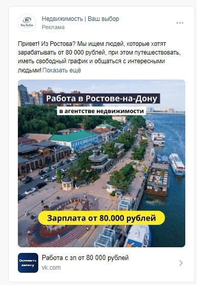 На связи Дмитрий. С 2019 года помогаю предпринимателям найти клиентов в интернете. Наше агентство работало более чем с 50 проектами из 25+ различных ниш и реализовало более 10 млн рекламного бюджета. Другие кейсы агентства можно посмотреть здесь: https://vk.com/@skuratovtarget Не хватает клиентов? Пишите "хочу заявки" сюда Клиент — агентство недвижимости в Ростове-на-дону. В июне-июле они открыли вакансию специалиста недвижимости. Цель — найти кандидатов на эту должность, записать на собеседование, а дальше по списку. Сразу перейдем к результатам. Период сотрудничества: 1 месяц Рекламный бюджет: 18 000 рублей Количество заявок: 40 Стоимость заявки: 450 рублей В объявлениях делали упор на популярные места города. Это цепляет взгляд и привлекает внимание к тексту: Трафик вели на лид-форму: Нужны клиенты для вашего бизнеса? Пиши "хочу заявки" сюда