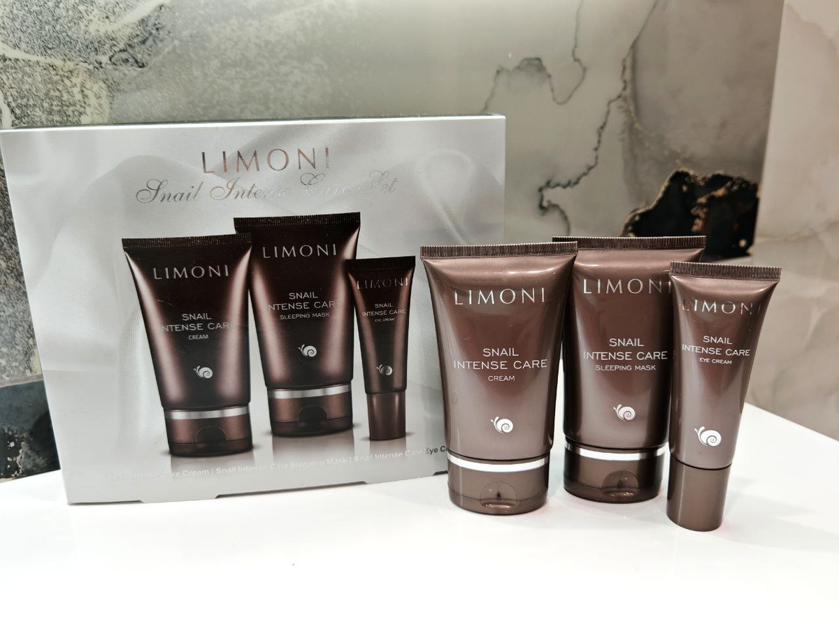 Сегодня у нас на повестке — набор от бренда LIMONI, который я купила на Озоне в качестве тест-драйва за около 1500 рублей. В комплекте три средства: крем для лица, крем для век и ночная маска. Всё — с муцином улитки и маркетинговыми обещаниями «омоложения, сияния и восстановления коллагена».