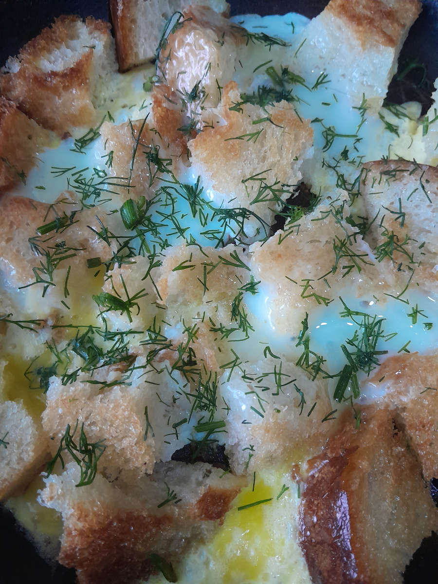 Представьте: золотистые, ароматные кубики хлеба с хрустящей корочкой, пропитанные сливочным маслом, и нежные яйца, которые обволакивают их мягкостью. Это не просто яичница — это взрыв текстур и вкусов в каждом кусочке! Простое, но невероятно сытное блюдо, которое готовится за считанные минуты, но дарит настоящее гастрономическое удовольствие. 🔺️Ингредиенты: 2–3 ломтика хлеба (лучше всего подойдет белый или зерновой) 2–3 куриных яйца Соль и перец по вкусу 1–2 ст. л. растительного или сливочного масла Зелень (по желанию) 🔺️Приготовление: 🔹️Подготовка хлеба Нарежьте хлеб небольшими кубиками (примерно 1–1,5 см). 🔹️Обжарка хлеба Разогрейте сковороду с маслом на среднем огне. Выложите хлебные кубики и обжаривайте, помешивая, до золотистой хрустящей корочки (3–5 минут). 🔹️Добавление яиц Уменьшите огонь до минимума. Аккуратно вбейте яйца прямо на хлебные кубики. Можно перемешать или оставить яйца целыми (как глазунью). 🔹️Завершение приготовления Посолите, поперчите, накройте крышк