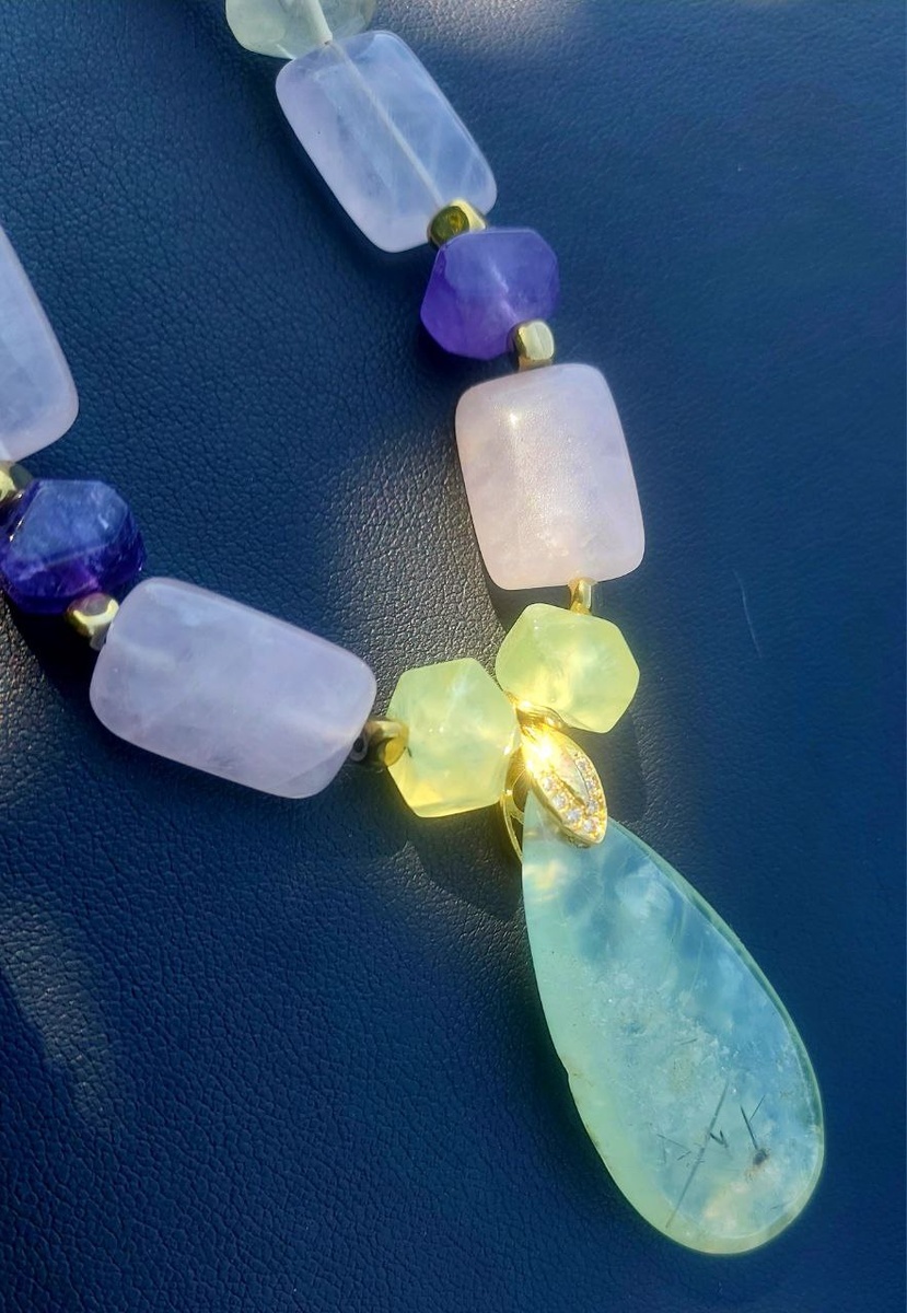 🌱ыкладываю третье колье. Оно на заказ, поэтому завтра утром после активации, фото удалю, а описание оставлю. 💍 🌱олье очень женственное ( по энергиям) и для довольно молодой женщины. Это о любви к себе и начале новой жизни.🙏 Я назвала его "Аврора".💍 🌱сновной камень - розовый кварц. Пусть он окутает материнской любовью девочку, которая живёт у вас внутри. 🍀 🌱метист ( фиолетовый) - поможет исцелить зависимость от прошлого. Уравновесит эмоции. 👩 🌱итрин ( желтый) поработает со Свадхистаной - это умение наслаждаться жизнью в её материальных аспектах ( "ешь, молись, люби"). 💍 🌱орный хрусталь - природный усилитель. И чистилищик. У вас там хорошие прозрачные, как горный ручей экземпляры - пусть очистит, унесёт тину боли и забот.🙏 🌱улон и камни рядом - это пренит. Уверена, что когда вы его увидите, он вас пленит. Потому что в нём тёплые воды родных озёр, кусочки водорослей и осколок солнце. Пусть его тепло согревает вашу верхнюю анахату.( тимус). 🌸 🌱 ещё пренит - это