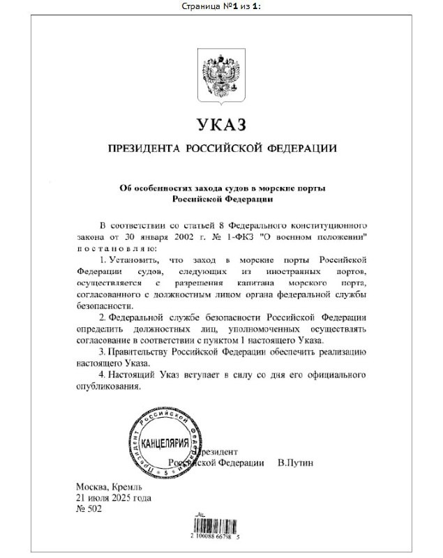 Заход в российские морские порты судов из иностранных портов будет разрешаться по согласованию с ФСБ, следует из указа, подписанного президентом РФ Путиным