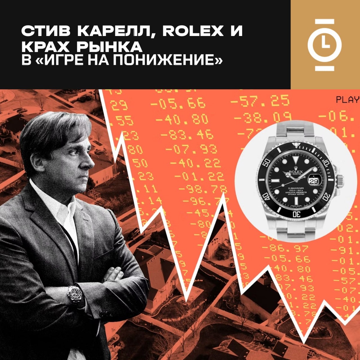 СТИВ КАРЕЛЛ, ROLEX И КРАХ РЫНКА В «ИГРЕ НА ПОНИЖЕНИЕ» #art_WD Фильм Адама Маккея «Игра на понижение», основанный на книге Майкла Льюиса, рассказывает о кризисе 2007–2008 годов, когда рынок ипотечных ценных бумаг обрушился, а несколько трейдеров сумели нажиться на этом. Один из них — Марк Баум (Стив Карелл), мрачный и эмоционально истощённый управляющий хедж-фондом, одержимый идеей наказать крупные банки. На его запястье — стальные часы Rolex Submariner Date ref. 116610LN диаметром 40 мм. Эта модель интересна не только дизайном, но и тем, что она попала в фильм с историческим несоответствием: часы были выпущены в 2010 году, а действия фильма происходят в 2007–2008. Тем не менее, их внешний вид идеально сочетается с образом Баумa — деловой костюм без галстука, упрямство и пренебрежение к показной роскоши. Submariner 116610LN — первая модель с так называемым «super case» (более массивным и прямоугольным корпусом), керамическим безелем и системой застёжки Glidelock. Эти особенности отл