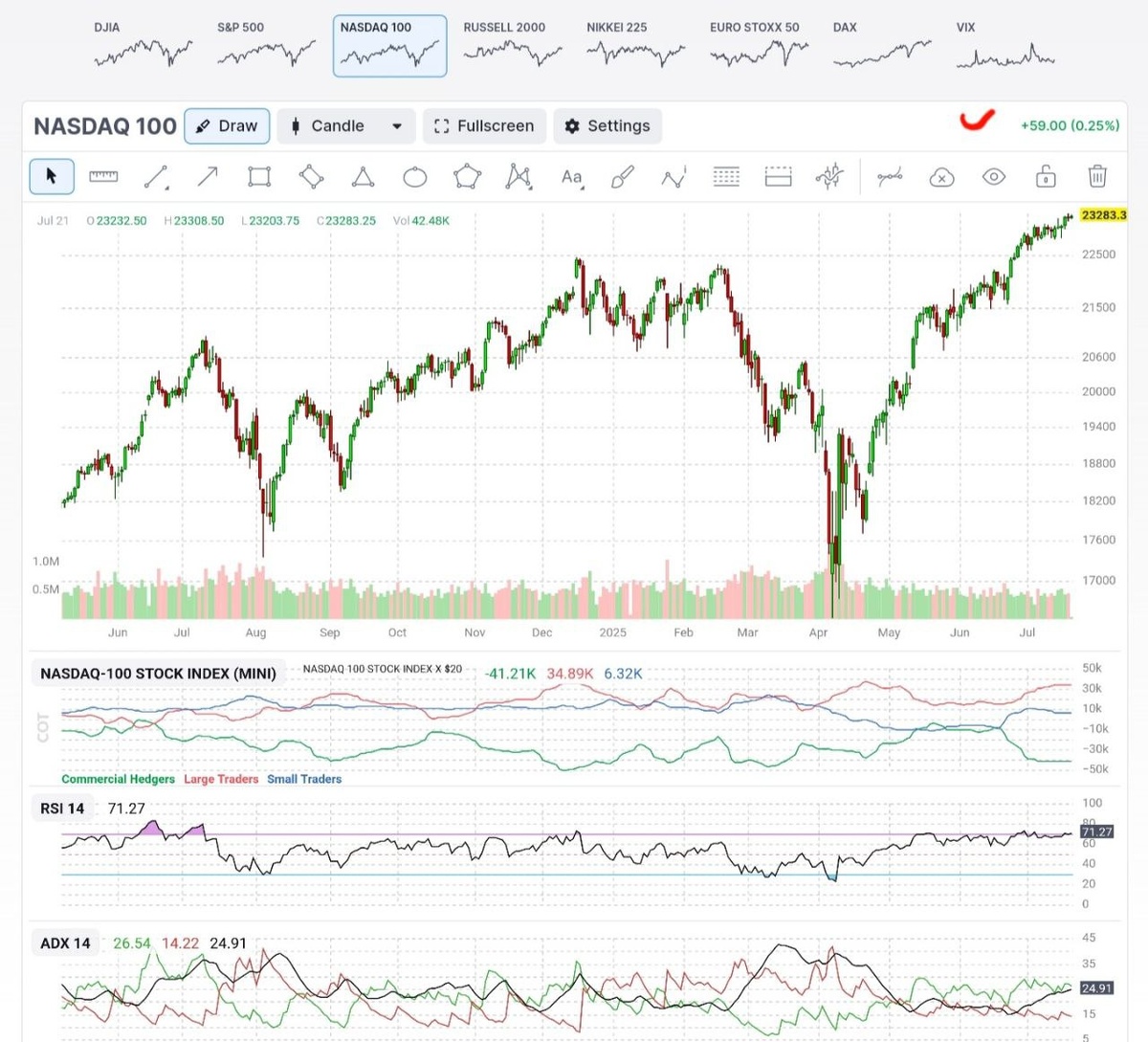 ⚡️Фьючерсы на Wall Street растут на фоне надежд на торговые сделки Фьючерсы на Wall Street поднимаются благодаря ожиданиям новых торговых сделок США с ключевыми партнерами и успешному старту сезона отчетности. Это поддерживает позитив среди инвесторов, несмотря на угрозы новых тарифов от администрации Трампа. Фьючерсы на S&P 500 выросли на 0,26%, NASDAQ 100 E-Minis — на 0,28%, Dow E-Minis — на 0,25%. Инвесторы надеются на прогресс в переговорах с ЕС, что поддерживает оптимизм. На прошлой неделе S&P 500 и NASDAQ достигли новых высот благодаря сильным экономическим данным и успешному началу отчетности, где 81,4% компаний превзошли ожидания. На этой неделе в центре внимания отчеты Alphabet и Tesla, чьи акции уже растут в предмаркете. Также важно следить за комментариями главы ФРС Джерома Пауэлла о будущей политике. Рост акций Tesla и Alphabet и позитивная динамика фьючерсов указывают на возможное продолжение роста рынка. Однако неопределенность в переговорах и возможные тарифы остаютс