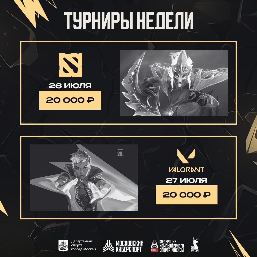 📆 Завершаем июль турнирами от CYBERMOS. Раписание: ☀️Dota 2 I 26 июля Регистрация — vk.cc/cNiGhT Призовой фонд — 20.000₽ ☀️Valorant I 27 июля Регистрация — vk.cc/cNiGtT Призовой фонд — 20.000₽ Турниры проходят онлайн — сражайся и побеждай, не выходя из дома! CYBERMOS. Подписаться