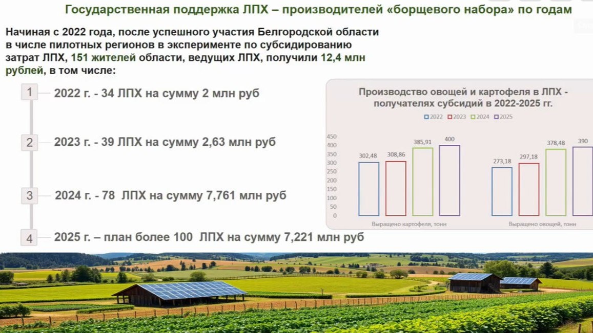 Более 3,3 тыс. соцконтрактов заключили на развитие личных подсобных хозяйств за 3,5 года К концу 2025 года планируется заключить 4130 социальных контрактов. Напомним, что в 2022 году область стала одним из трёх пилотных регионов, участвовавших в эксперименте по субсидированию затрат на сельскохозяйственное производство. Регион получил федеральные средства на поддержку личных подсобных хозяйств. За это время 151 белгородцу выделили 12,4 млн рублей. Планируется, что в 2025 году субсидии получат более 100 жителей на общую сумму 7,2 млн рублей. Кроме того, по инициативе Вячеслава Гладкова, в 2023 году семи производителям овощей направили более 750 тыс. рублей на строительство и приобретение теплиц, в 2024 году – 13 производителям более 1,9 млн рублей. «Мы проводим встречи с жителями сёл и разъясняем возможности поддержки. В текущем году эти выезды также запланированы у нас с августа по октябрь», – отметил замгубернатора Андрей Антоненко. Подписаться на нас|Предложить новость