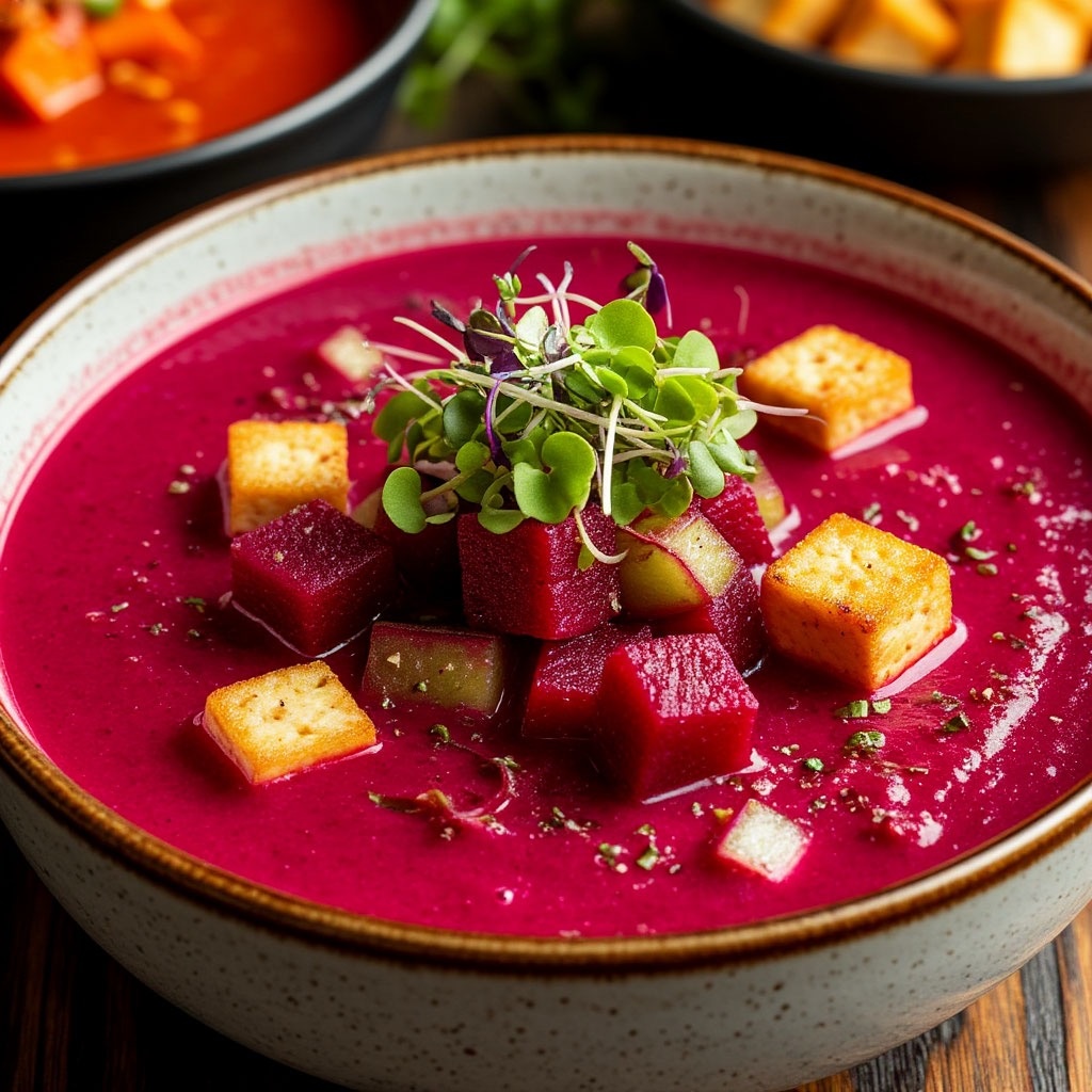 В жару хочется не просто еды, а по-настоящему освежающей еды — чего-то лёгкого, яркого, неожиданного! Острый свекольник без яиц и мяса — это не обычный холодный суп, а взрыв вкуса, который бодрит с первой ложки и рушит стереотипы о «пресных вегетарианских блюдах». Забудьте обо всём, что ты слышали о классических свекольниках. Этот летний суп насыщен овощами, острыми нотками и сытным обжаренным тофу. Если ты ищешь рецепт, который удивит не только тебя, но и всех, кто попробует его впервые, — самое время добавить этот необычный свекольник в закладки. Быстро, просто, по-настоящему летний. Узнайте, почему его стоит попробовать каждой семье этим летом! Свекольник по этому рецепту полностью веганский: ни мяса, ни молочных продуктов, ни яиц. Вместо них используется обжаренный тофу. Это идеальный выбор для вегетарианцев, постящихся, тех, кто придерживается здорового питания или ищет низкокалорийный суп на каждый день. Острый свекольник освежает, насыщает, даёт энергию и помогает разно