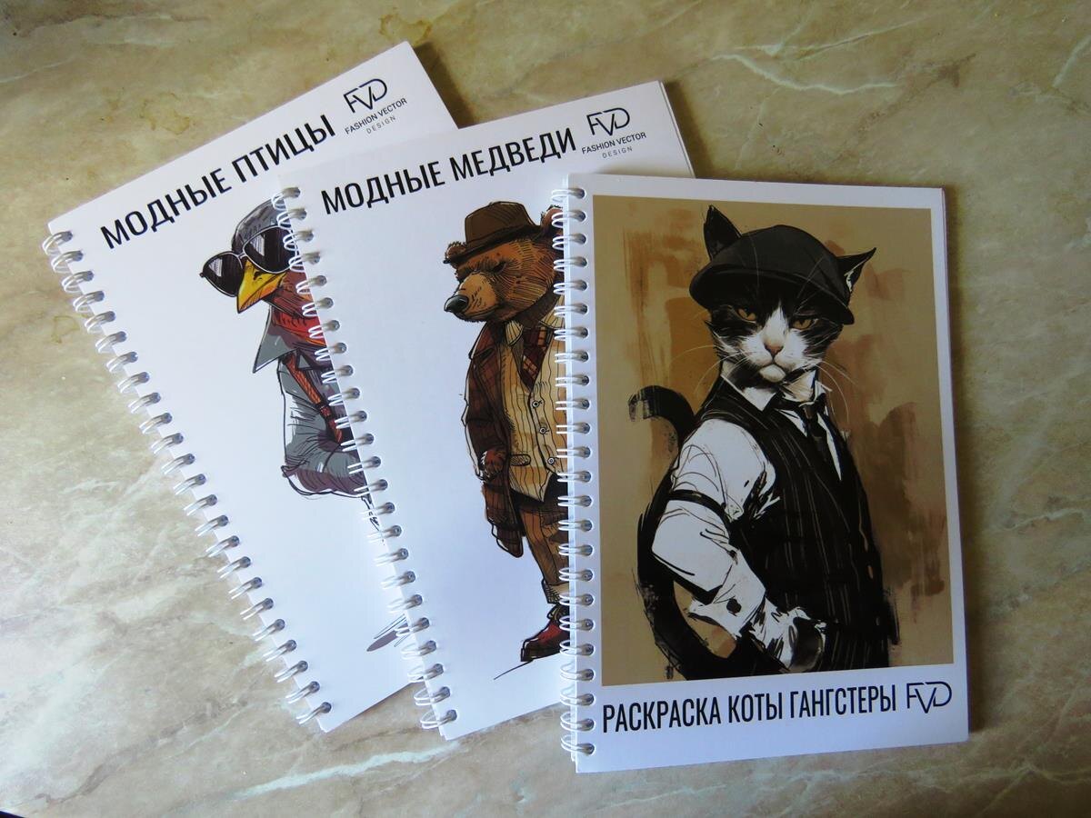 Есть цветы и царевны, альбомы, посвящённые популярным героям и пираты, есть просто платья разного стиля, этакие своеобразные журналы мод, только не раскрашенные. Особенно выделяется кошачья серия и та, что делает модными самых разных животных. Все названия состоят из трёх слов. Первые два неизменны – раскраска, коты. А дальше обозначается тематика. Эскизы всех альбомов представлены на задней обложке каждого из них. В кошачьей серии это гангстеры, сердце, школа, вечеринка, на море, новый год, пасха, профессии, хэллоуин, цветы. Всем канонам fashion-иллюстрации соответствует серия, посвящённая модным животным. черепахи, собаки, слоны, лошади, волки, львы, медведи, акулы, коты, птицы, жирафы, змеи, ёжики, овцы, лисы, гориллы, мыши, белки и кролики. альбомы для раскрашивания с односторонней печатью на бумаге плотностью 120г/м2, глянцевой картонной обложкой, креплением листов на спираль. Для предотвращения протекания пишущих инструментов на следующую картинку имеется плотный вкладыш. На ка