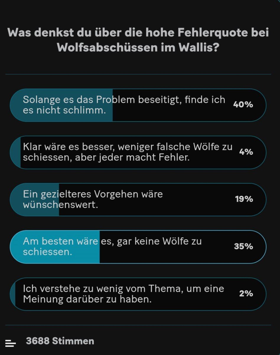 Что вы думаете о высокой частоте ошибок при отстреле волков в Вале? Если это устранит проблему, то я не думаю, что это плохо. 40% Конечно, было бы лучше отстреливать меньше неправильных волков, но все совершают ошибки. 4% Хотелось бы более целенаправленного подхода. 19 % Лучше вообще не отстреливать волков. 35 % Я недостаточно понимаю этот вопрос, чтобы иметь по нему мнение. 2%