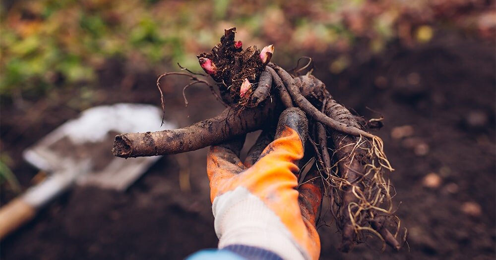 2. Приподнимите корневище - подденьте корневую систему лопатой и аккуратно расшатывайте растение по кругу, пока оно не освободится.
