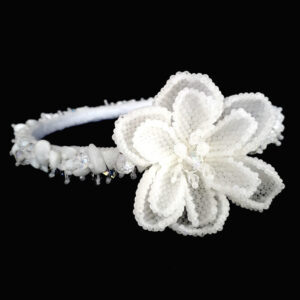 Пришиваем цветок к ободку. Подхватываем стежками основу ободка. Со стороны цветка проходим через бисерины. В идеале для надежного крепления нужно подхватить бисерины 2 лепестков с одной стороны и бисерины 2 лепестков с другой стороны цветка.