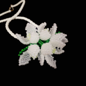 Материалы: мононить, бисер белый, зелёный, светло-жёлтый или светло-зелёный для серединки, игла, замок, колечки, жгут для подвешивания кулона (можно сделать из бисера) Процесс плетения: https://youtu.be/nlHZqHY76TA и https://rutube.ru/video/f45eaacc56577baff6718ddb887936d5/ Для начала плетём серединку. Из белого бисера проплетаем ряды жгута ндбеле на 6 бисерин Набрать 4 бисерины, провести нить через первые 2. Отрезок нити на конце оставить около 40 см., она нам пригодиться в будущем. Нить отрезаем комфортной длины Подплести ещё 2 бисерины Таким образом подплести несколько рядов до 6 шт. Соединяем начало и конец Получается кольцо из шести бисерин. Далее плетём ряды ндбеле. Набираем 2 бисерины и проводим в соседнюю бисерину на кольце. Выводим нить из следующей соседней бисерины Далее также набираем 2 бисерины, нить проводим в сосденюю, выводим через следующую соседнюю. Снова набираем 2 бисерины, проводим в соседнюю, выводим через следующую соседнюю и бисерину первого ряда ндбеле (через