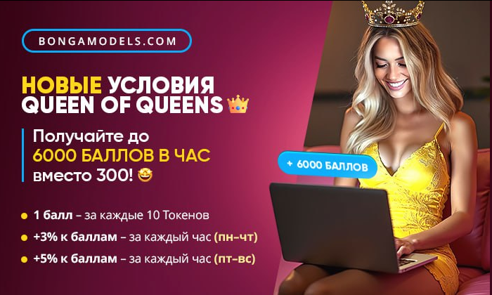 Теперь обновленная система начисления баллов в конкурсе Queen of Queens стала еще более привлекательной 💫 *️⃣вы можете получать до 6000 баллов в час, вместо прежних 300! 📎Новые условия получения баллов: 🌟+1 балл – за каждые заработанные 10 токенов (вместо 100 токенов ранее). 🌟+3% к баллам (вместо 1%) – за каждый час онлайн с понедельника по четверг. 🌟+5% к баллам (вместо 2%) – за каждый час онлайн с пятницы по воскресенье. #BongaCams #News