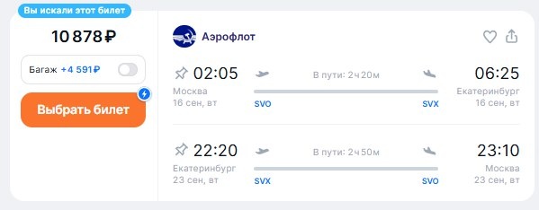 ✈️Москва - Екатеринбург, туда и обратно за 10900 рублей