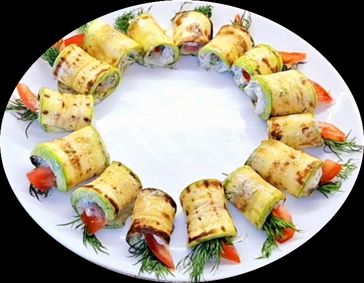 Такая закуска выглядит очень красиво, аккуратно и нарядно. Кабачок, зелень, помидор — что может быть вкуснее? А если положить вместо помидора кусочек слабосолёной сёмги, то вообще будет ням-ням-ням!