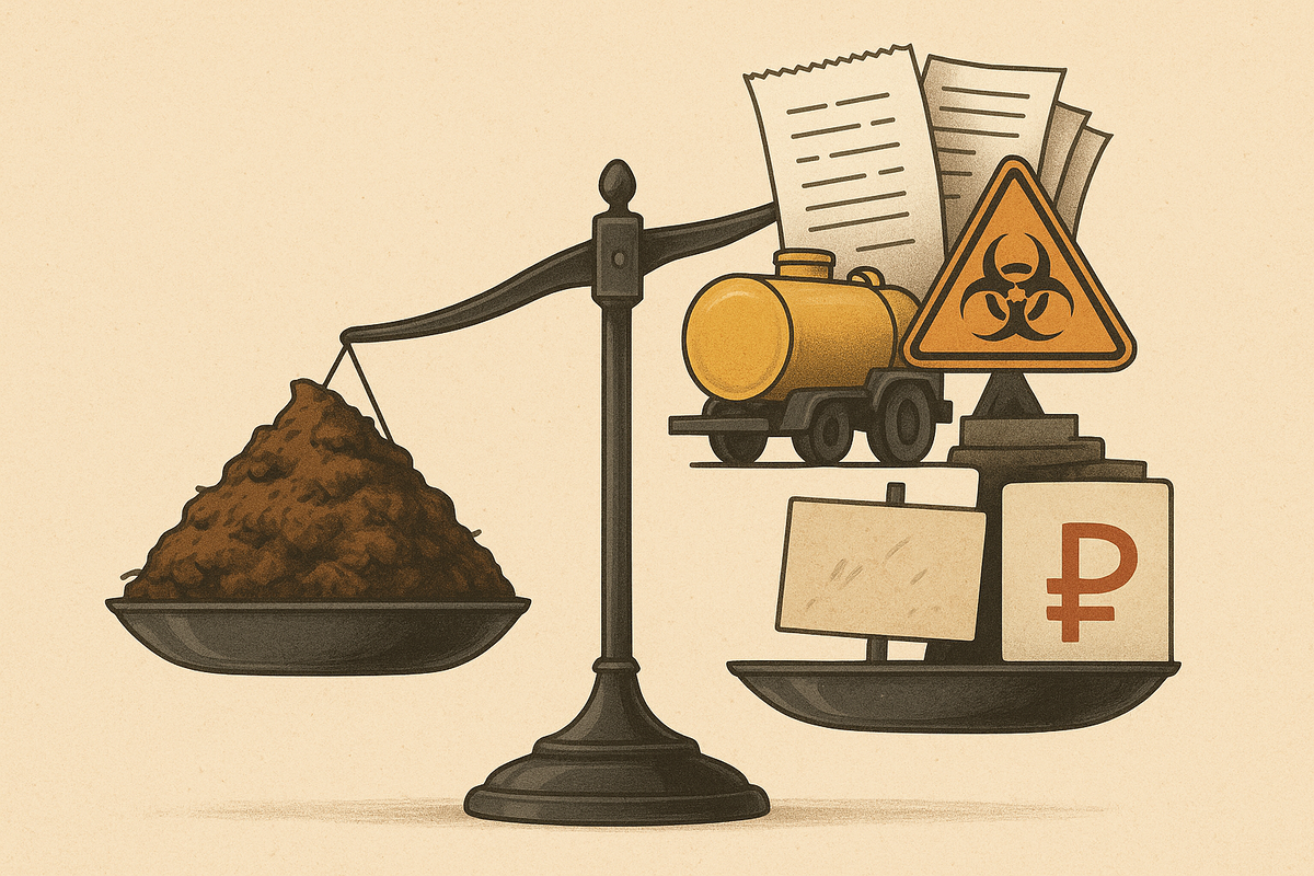 Навоз на ферме действительно появляется «бесплатно» — как побочный продукт животноводства. Но дальше начинается экономика. Если этот навоз нужно только убрать с проходов, он превращается в логистику. Если нужно временно складировать — это уже экология. Если вносить на поля — это затраты, контроль, техника, нормативы и ответственность. Себестоимость «бесплатного» навоза растёт с каждой новой задачей. Складирование требует специальных площадок. А по действующим законам (ФЗ-248, Постановление №1940) навоз признаётся побочным продуктом животноводства с экологическим классом опасности (3 или 4), а значит — его перемещение, хранение и переработка подлежат строгому контролю. Требуется маркировка, учёт, согласования. Любое отклонение — риск штрафов. Транспортировка — отдельная статья расходов. Навоз — тяжелый, влажный, объемный. Чтобы вывезти 20 тонн на поле (примерно столько даёт 200 голов в день), нужно минимум 2 рейса трактором с бочкой. А если поле — далеко, расходы кратно возрастают. Хран